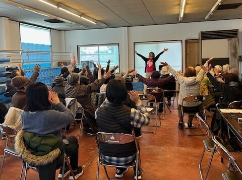 笑いヨガは、笑いの動作とヨガの呼吸法を組み合わせた健康体操です。最初は少し照れのあった参加者の皆さんも、手拍子やリズムに合わせるうちに自然と笑顔がこぼれ、最後には全身を使って大きな笑いの花を咲かせていました。